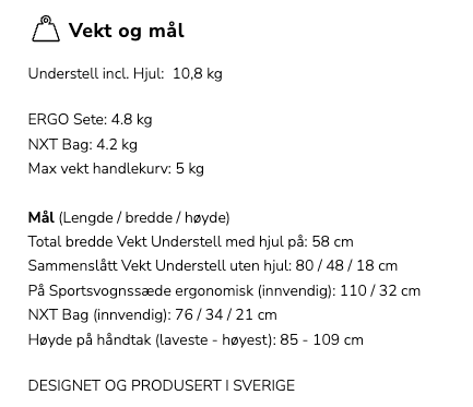 Veldig romslig fra 6 måneder og vekt opp til 22 kg. Rammen er laget av anodisert, skandinavisk aluminium.